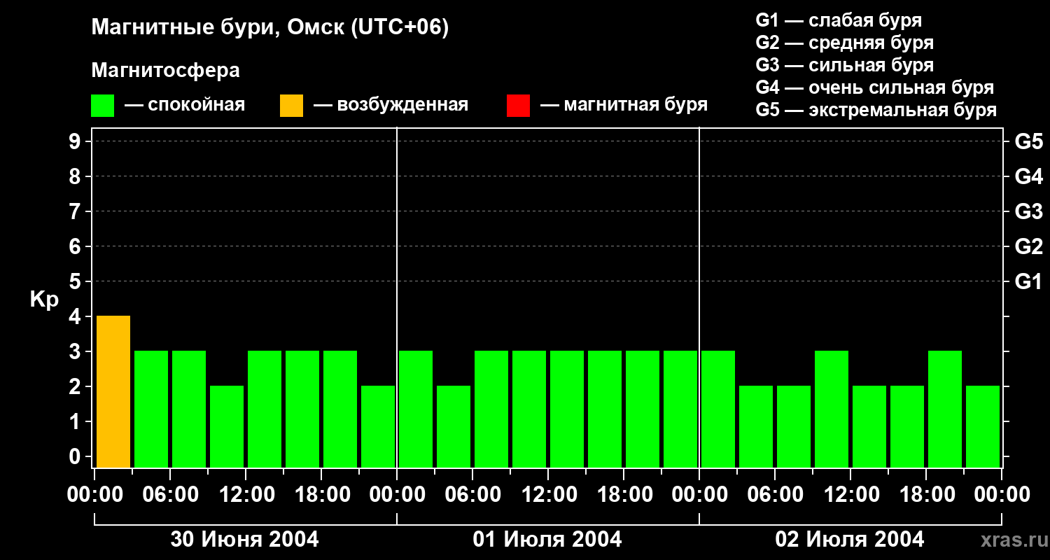 Изменения геомагнитного индекса Kp с 30 июня по 2 июля 2004 года для средних широт