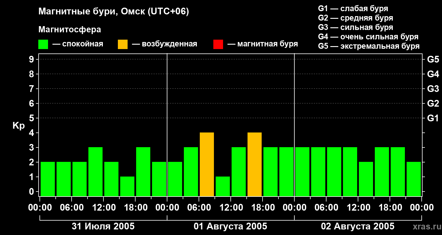 Изменения геомагнитного индекса Kp с 31 июля по 2 августа 2005 года для средних широт
