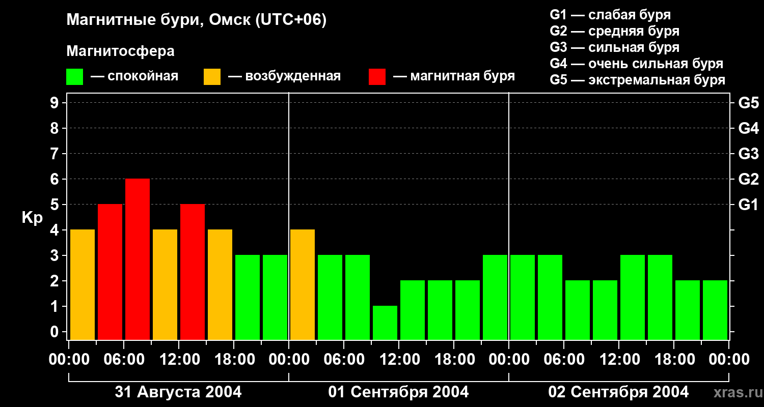 Изменения геомагнитного индекса Kp с 31 августа по 2 сентября 2004 года для средних широт