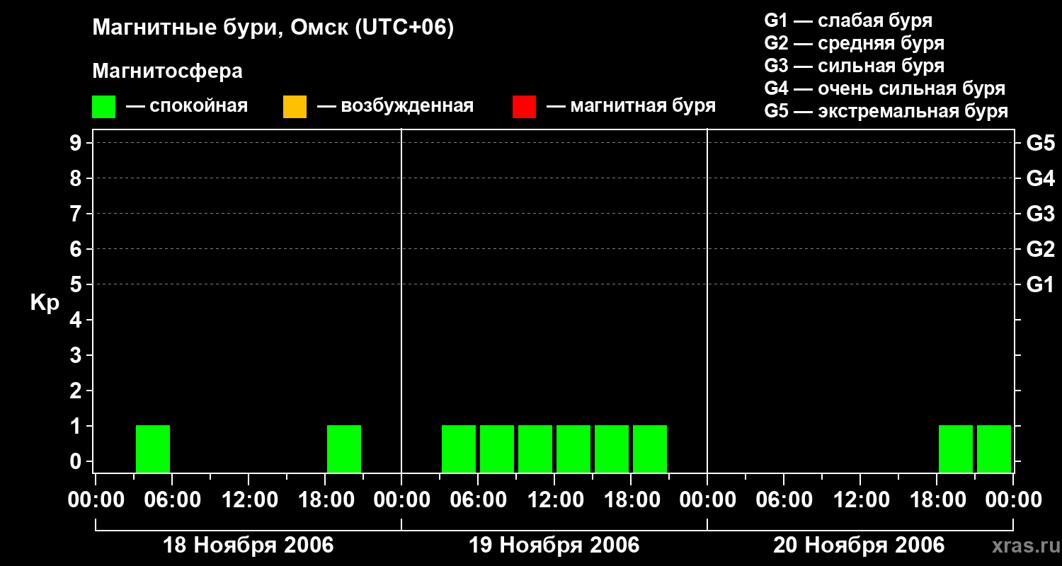 Изменения геомагнитного индекса Kp с 18 по 20 ноября 2006 года для средних широт