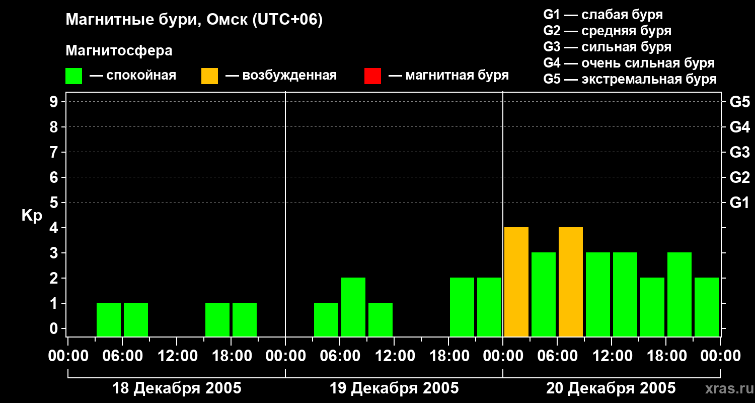 Изменения геомагнитного индекса Kp с 18 по 20 декабря 2005 года для средних широт