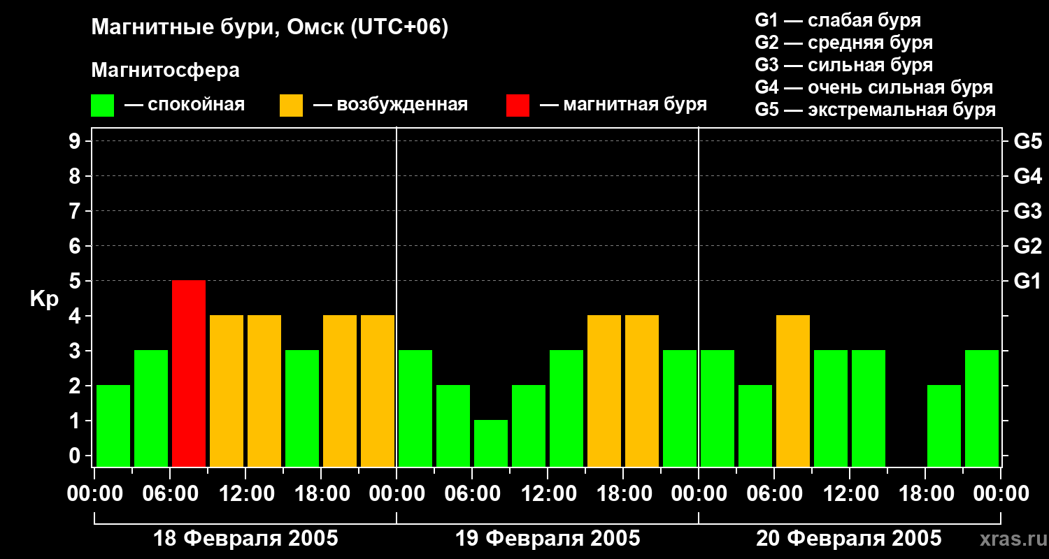 Изменения геомагнитного индекса Kp с 18 по 20 февраля 2005 года для средних широт