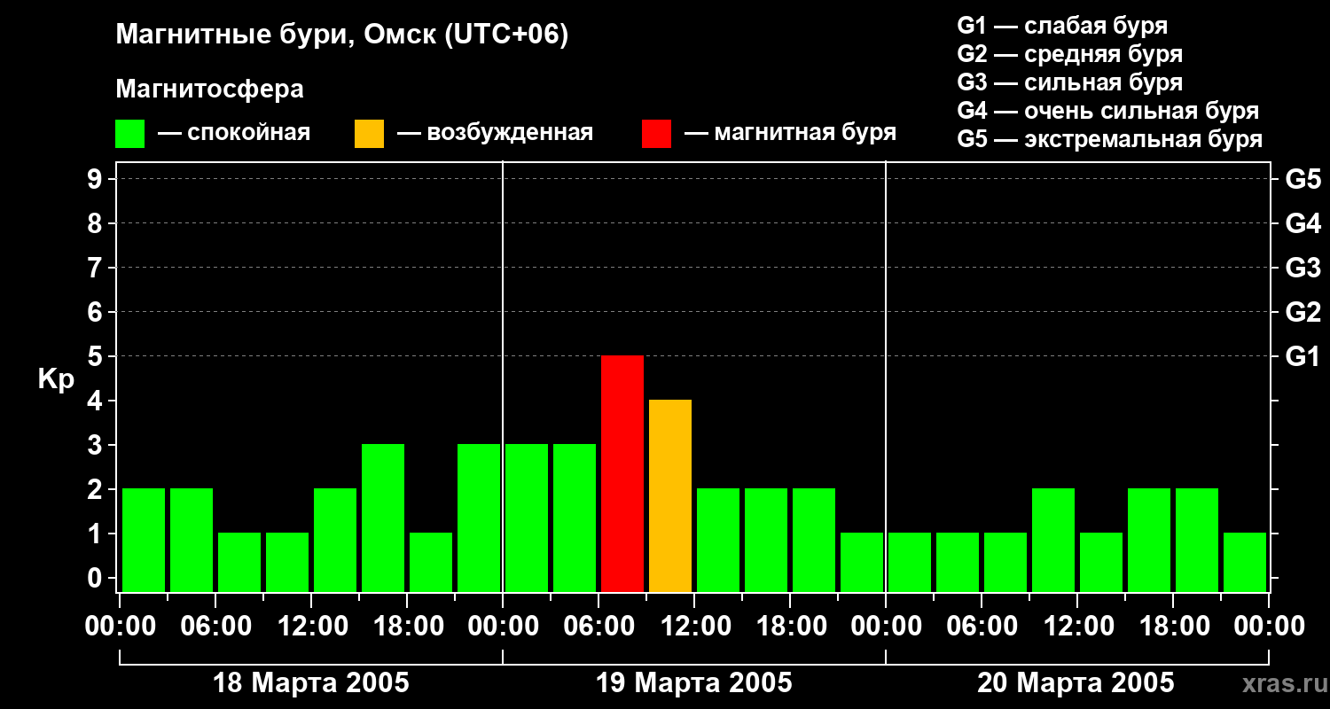 Изменения геомагнитного индекса Kp с 18 по 20 марта 2005 года для средних широт