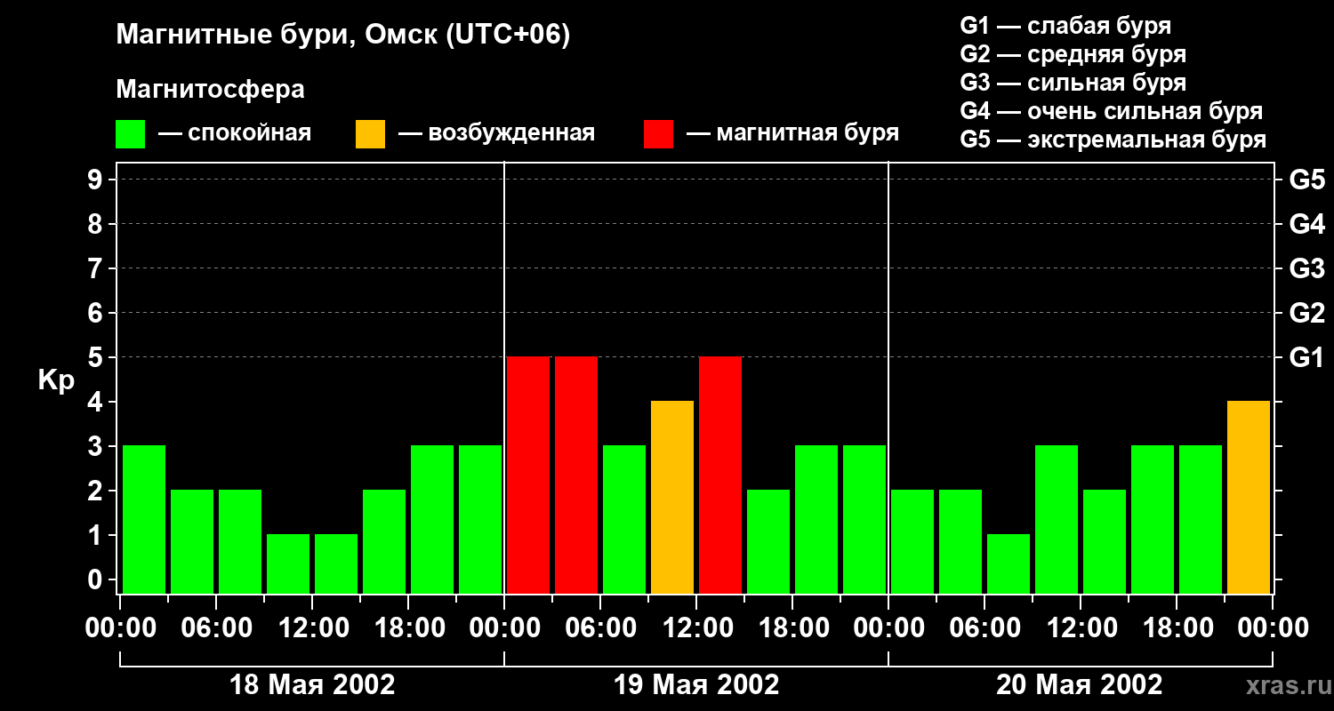Изменения геомагнитного индекса Kp с 18 по 20 мая 2002 года для средних широт