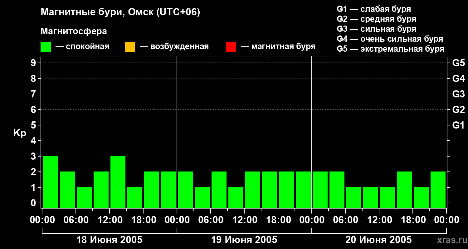 Изменения геомагнитного индекса Kp с 18 по 20 июня 2005 года для средних широт