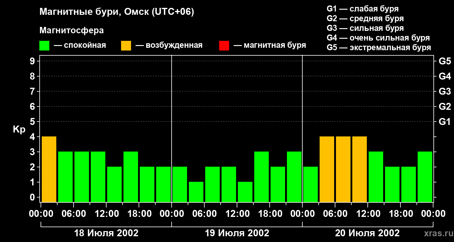 Изменения геомагнитного индекса Kp с 18 по 20 июля 2002 года для средних широт