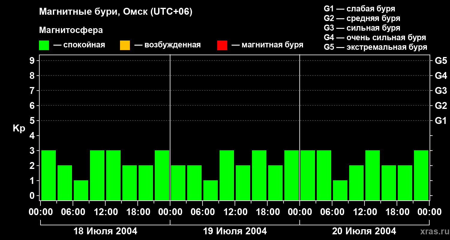 Изменения геомагнитного индекса Kp с 18 по 20 июля 2004 года для средних широт