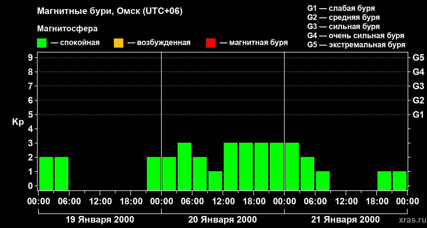 Изменения геомагнитного индекса Kp с 19 по 21 января 2000 года для средних широт