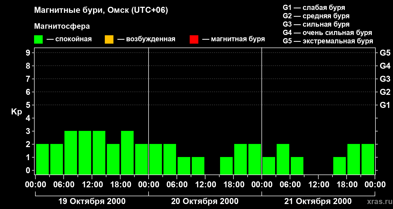 Изменения геомагнитного индекса Kp с 19 по 21 октября 2000 года для средних широт