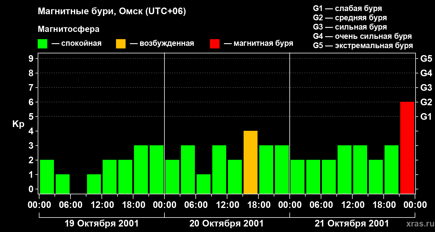 Изменения геомагнитного индекса Kp с 19 по 21 октября 2001 года для средних широт