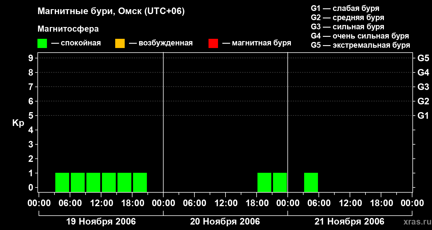 Изменения геомагнитного индекса Kp с 19 по 21 ноября 2006 года для средних широт