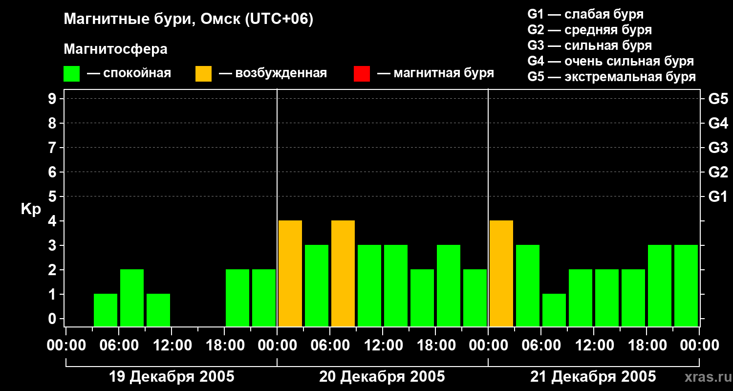 Изменения геомагнитного индекса Kp с 19 по 21 декабря 2005 года для средних широт