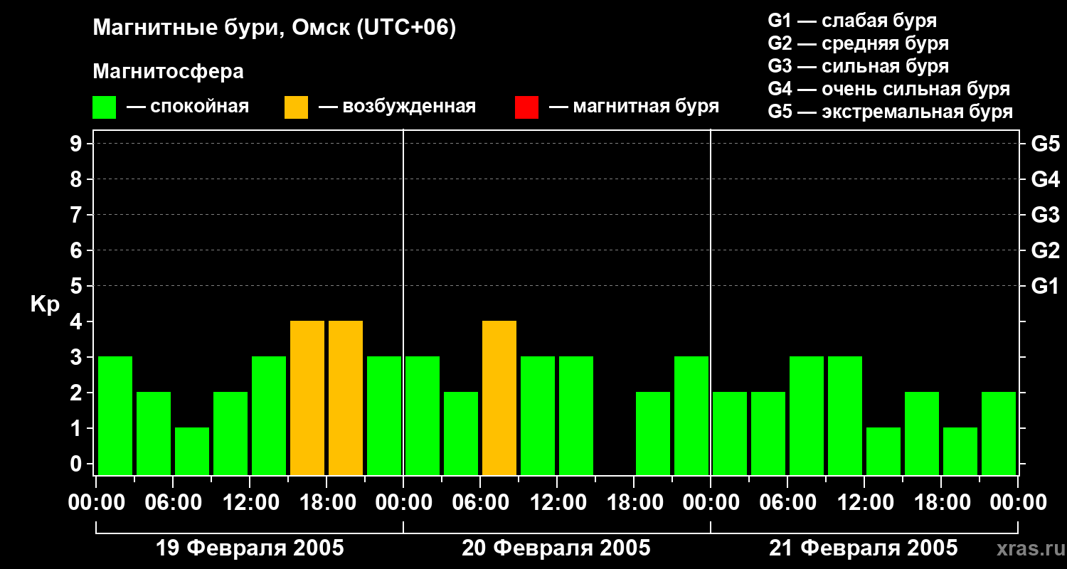 Изменения геомагнитного индекса Kp с 19 по 21 февраля 2005 года для средних широт