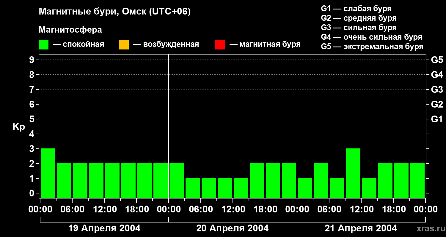 Изменения геомагнитного индекса Kp с 19 по 21 апреля 2004 года для средних широт