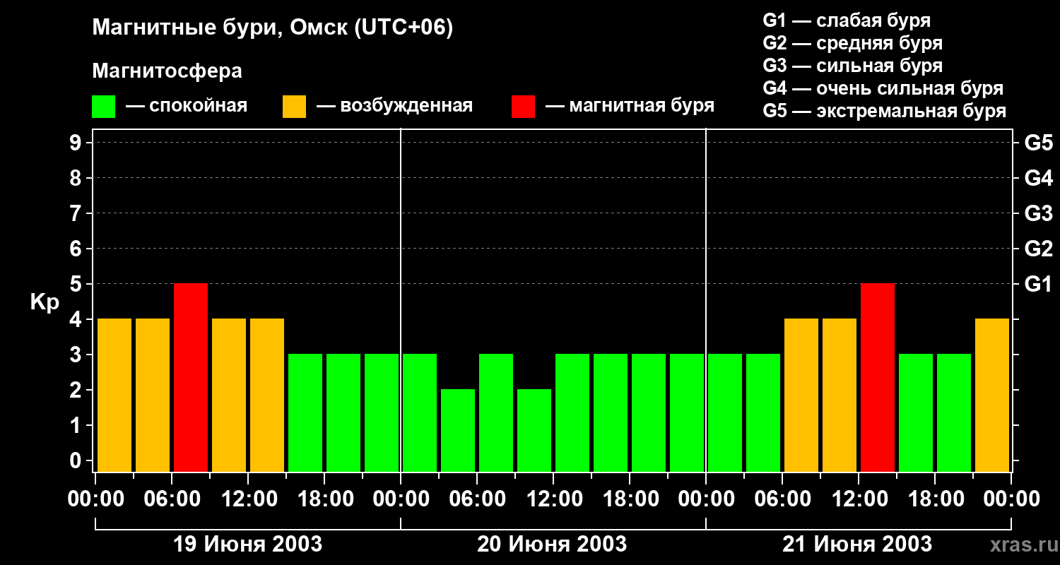 Изменения геомагнитного индекса Kp с 19 по 21 июня 2003 года для средних широт