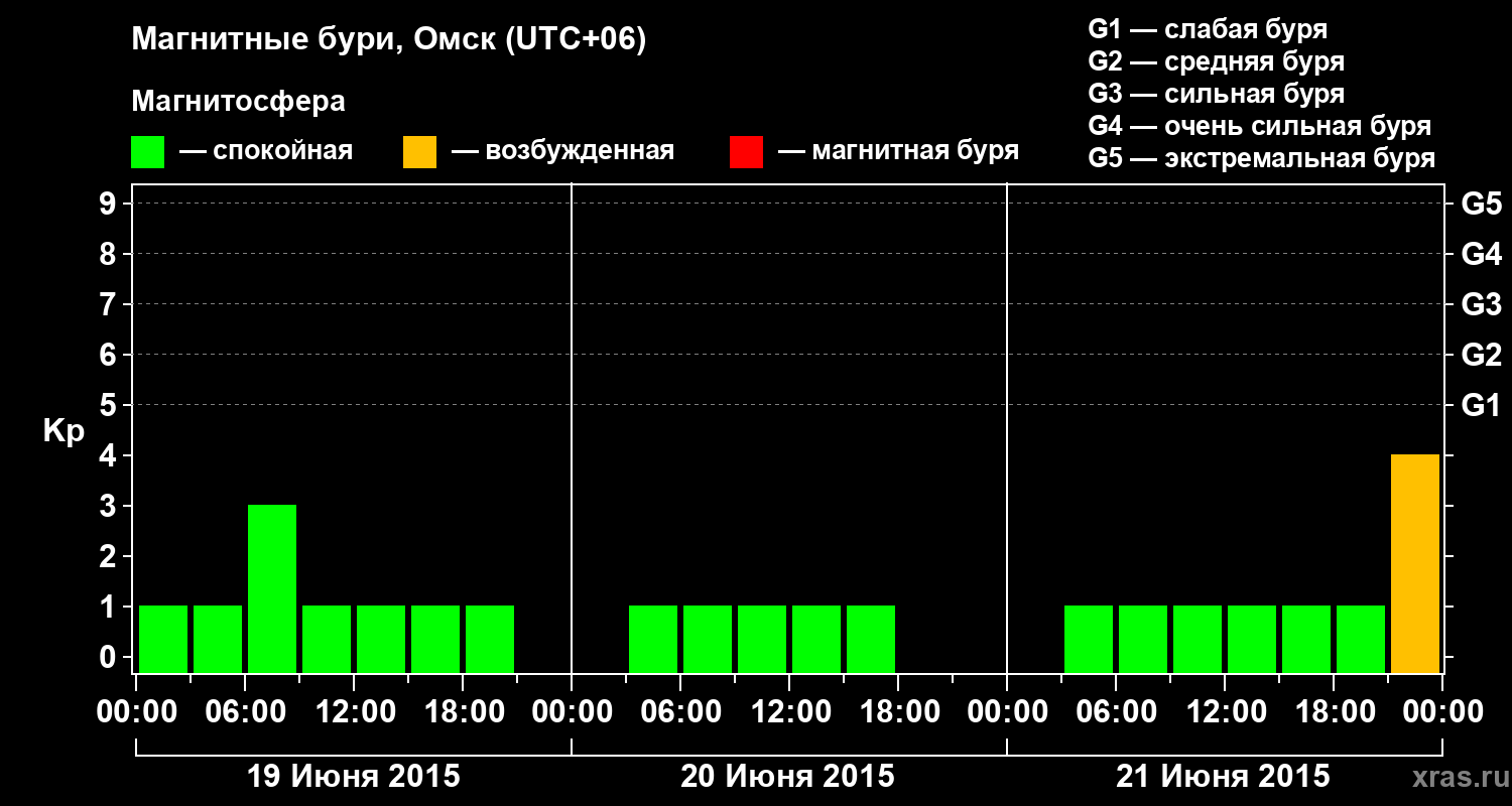 Изменения геомагнитного индекса Kp с 19 по 21 июня 2015 года для средних широт