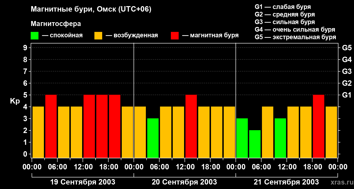 Изменения геомагнитного индекса Kp с 19 по 21 сентября 2003 года для средних широт