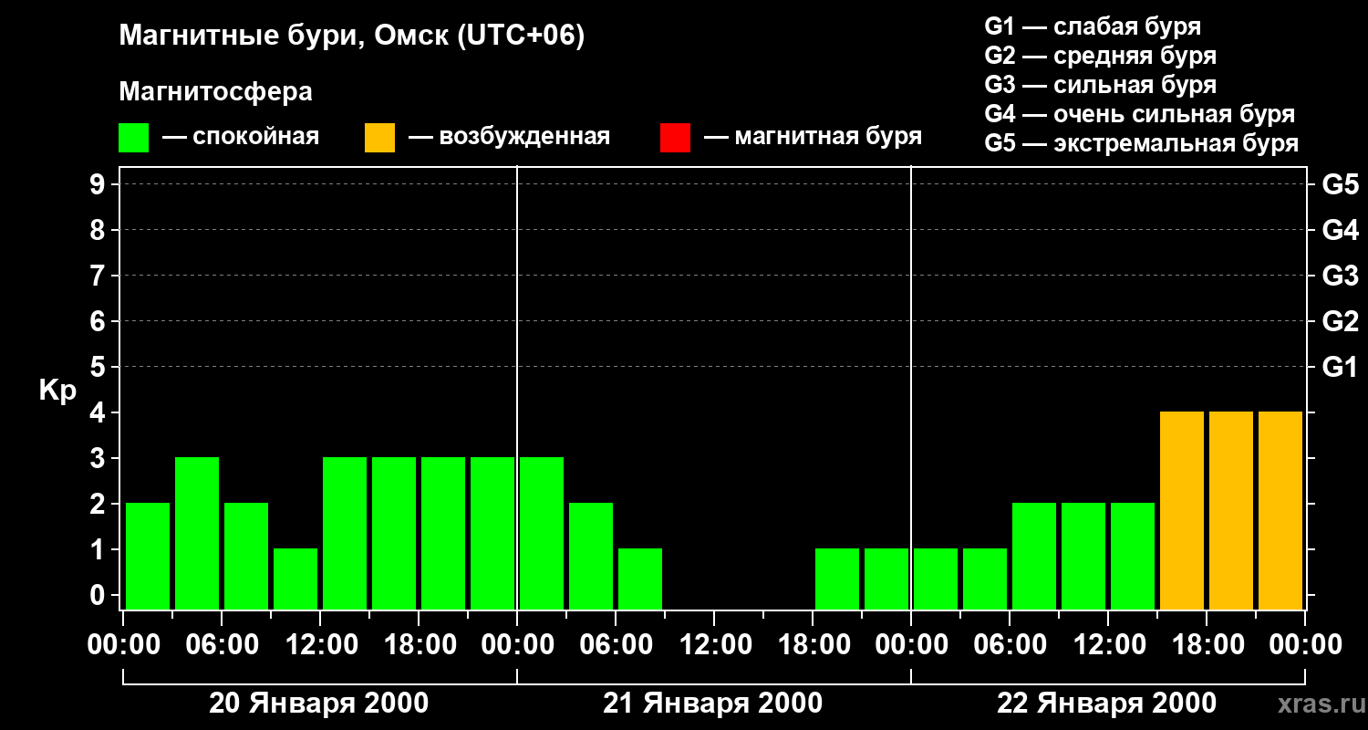 Изменения геомагнитного индекса Kp с 20 по 22 января 2000 года для средних широт