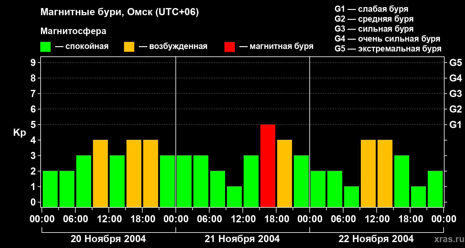 Изменения геомагнитного индекса Kp с 20 по 22 ноября 2004 года для средних широт