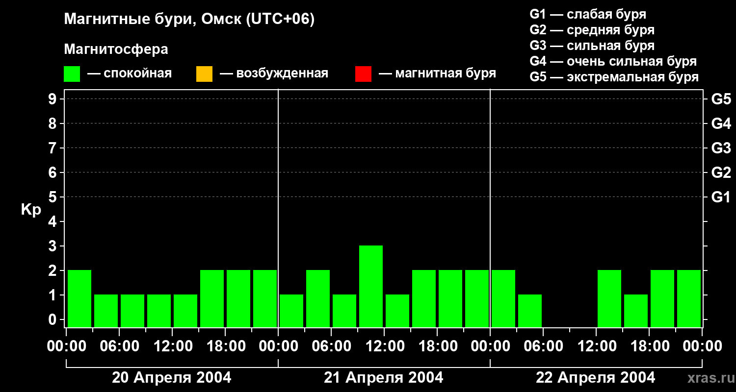 Изменения геомагнитного индекса Kp с 20 по 22 апреля 2004 года для средних широт