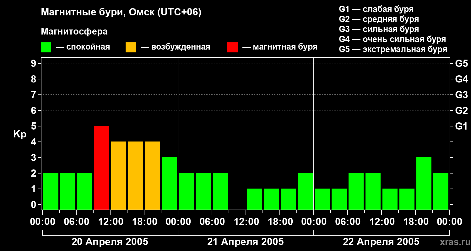 Изменения геомагнитного индекса Kp с 20 по 22 апреля 2005 года для средних широт
