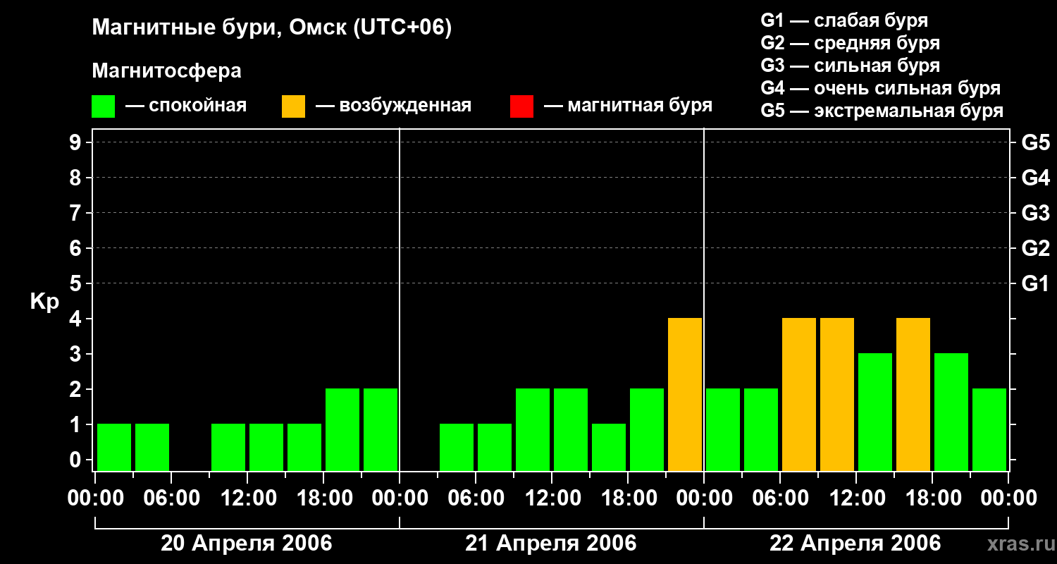 Изменения геомагнитного индекса Kp с 20 по 22 апреля 2006 года для средних широт