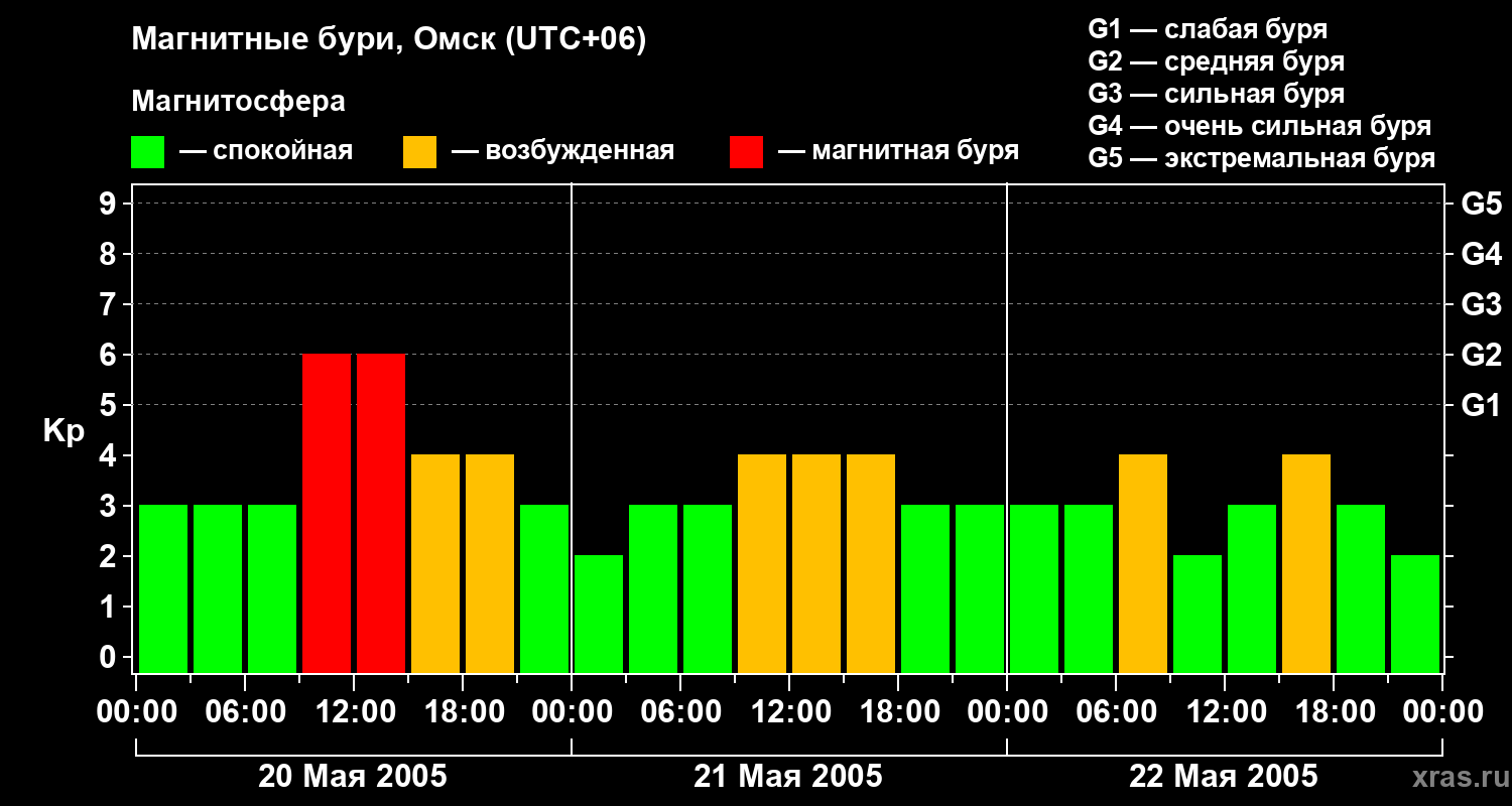 Изменения геомагнитного индекса Kp с 20 по 22 мая 2005 года для средних широт