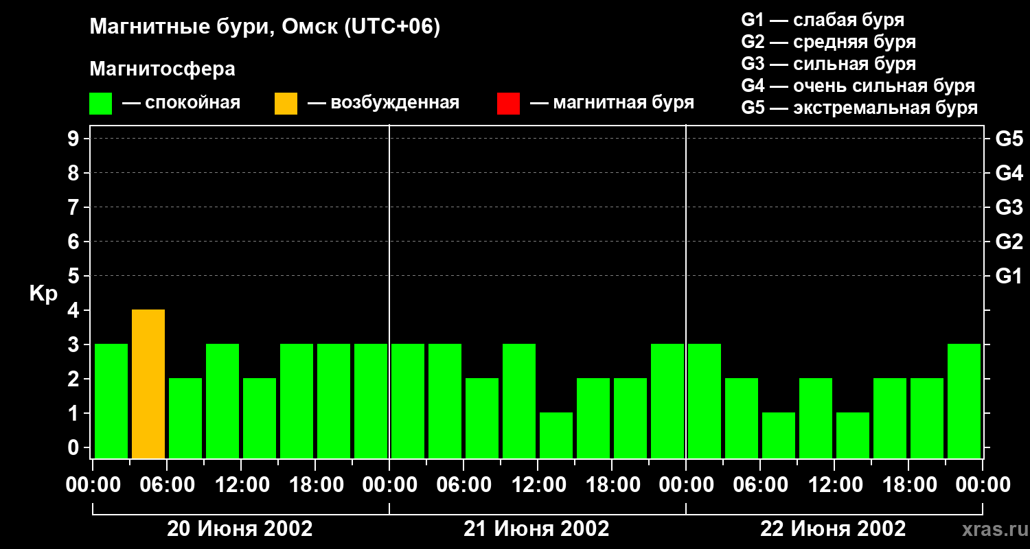 Изменения геомагнитного индекса Kp с 20 по 22 июня 2002 года для средних широт