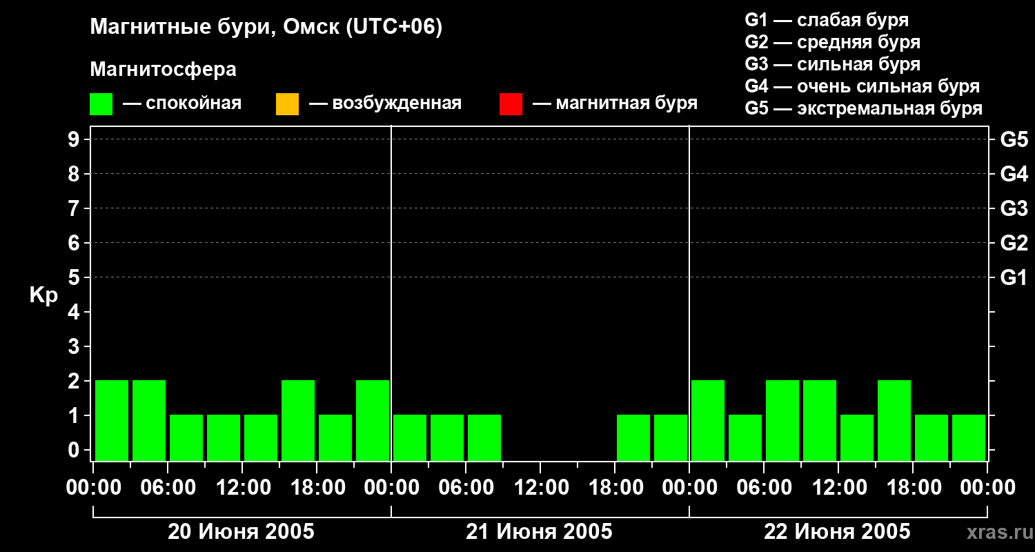 Изменения геомагнитного индекса Kp с 20 по 22 июня 2005 года для средних широт