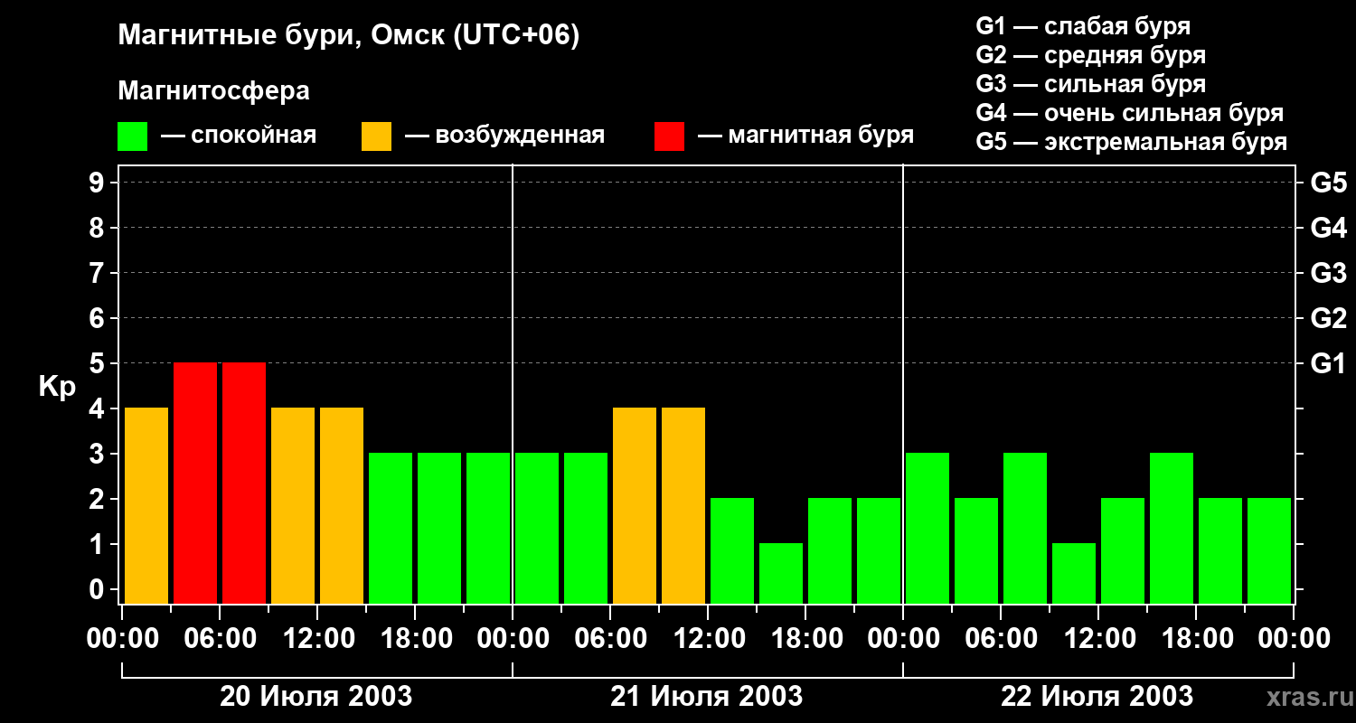 Изменения геомагнитного индекса Kp с 20 по 22 июля 2003 года для средних широт