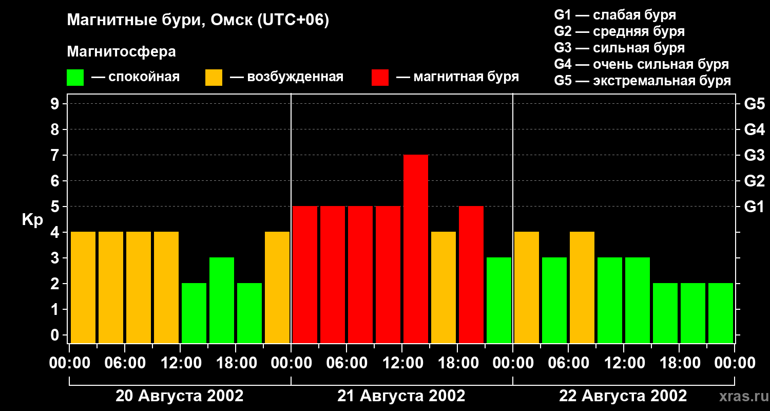Изменения геомагнитного индекса Kp с 20 по 22 августа 2002 года для средних широт
