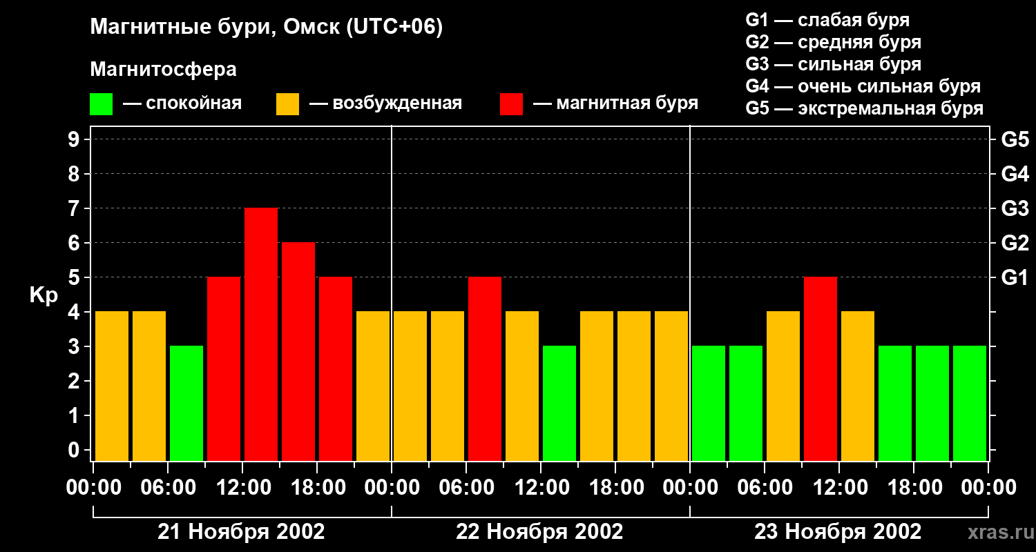 Изменения геомагнитного индекса Kp с 21 по 23 ноября 2002 года для средних широт