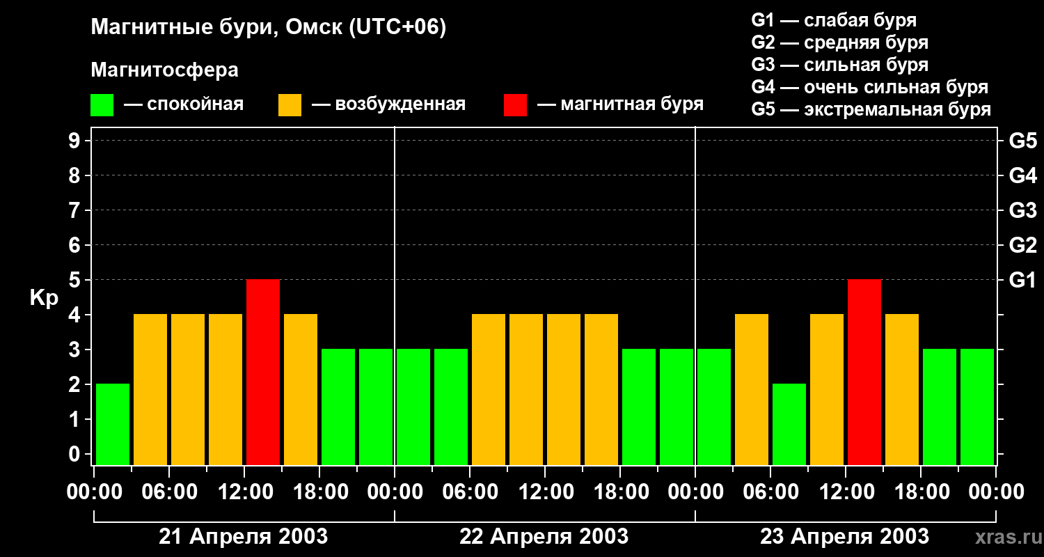 Изменения геомагнитного индекса Kp с 21 по 23 апреля 2003 года для средних широт