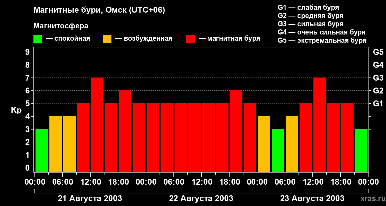 Изменения геомагнитного индекса Kp с 21 по 23 августа 2003 года для средних широт