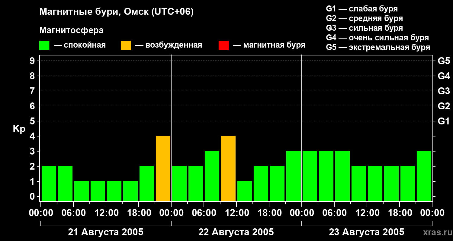 Изменения геомагнитного индекса Kp с 21 по 23 августа 2005 года для средних широт