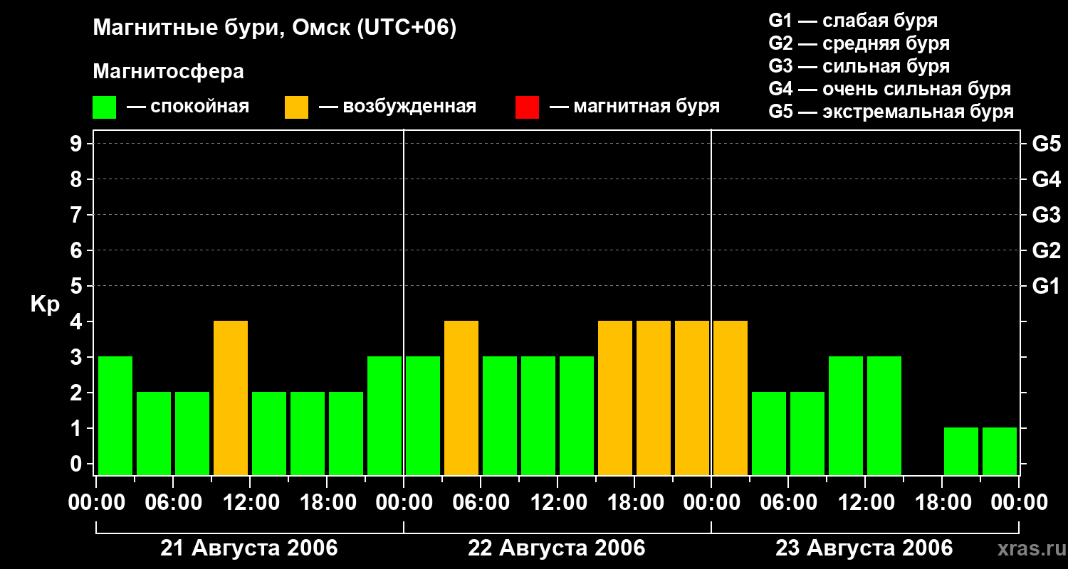 Изменения геомагнитного индекса Kp с 21 по 23 августа 2006 года для средних широт