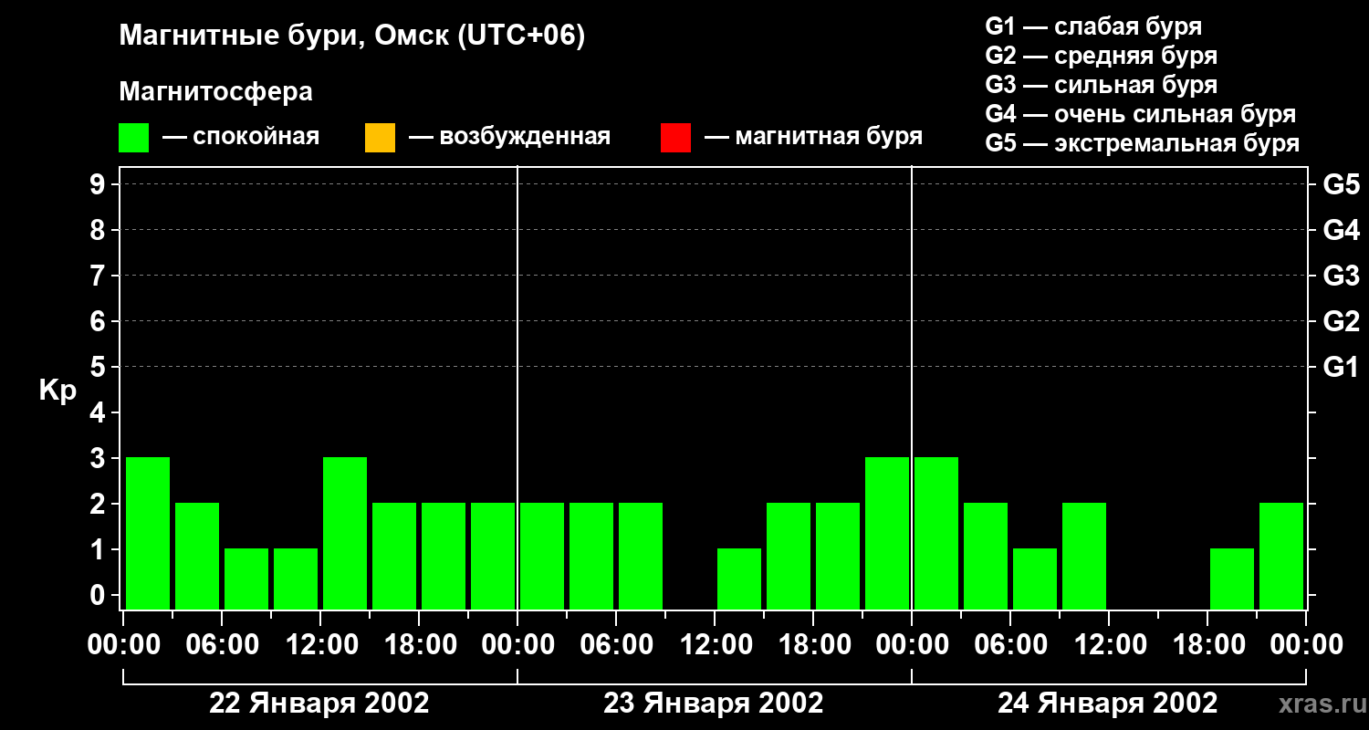 Изменения геомагнитного индекса Kp с 22 по 24 января 2002 года для средних широт