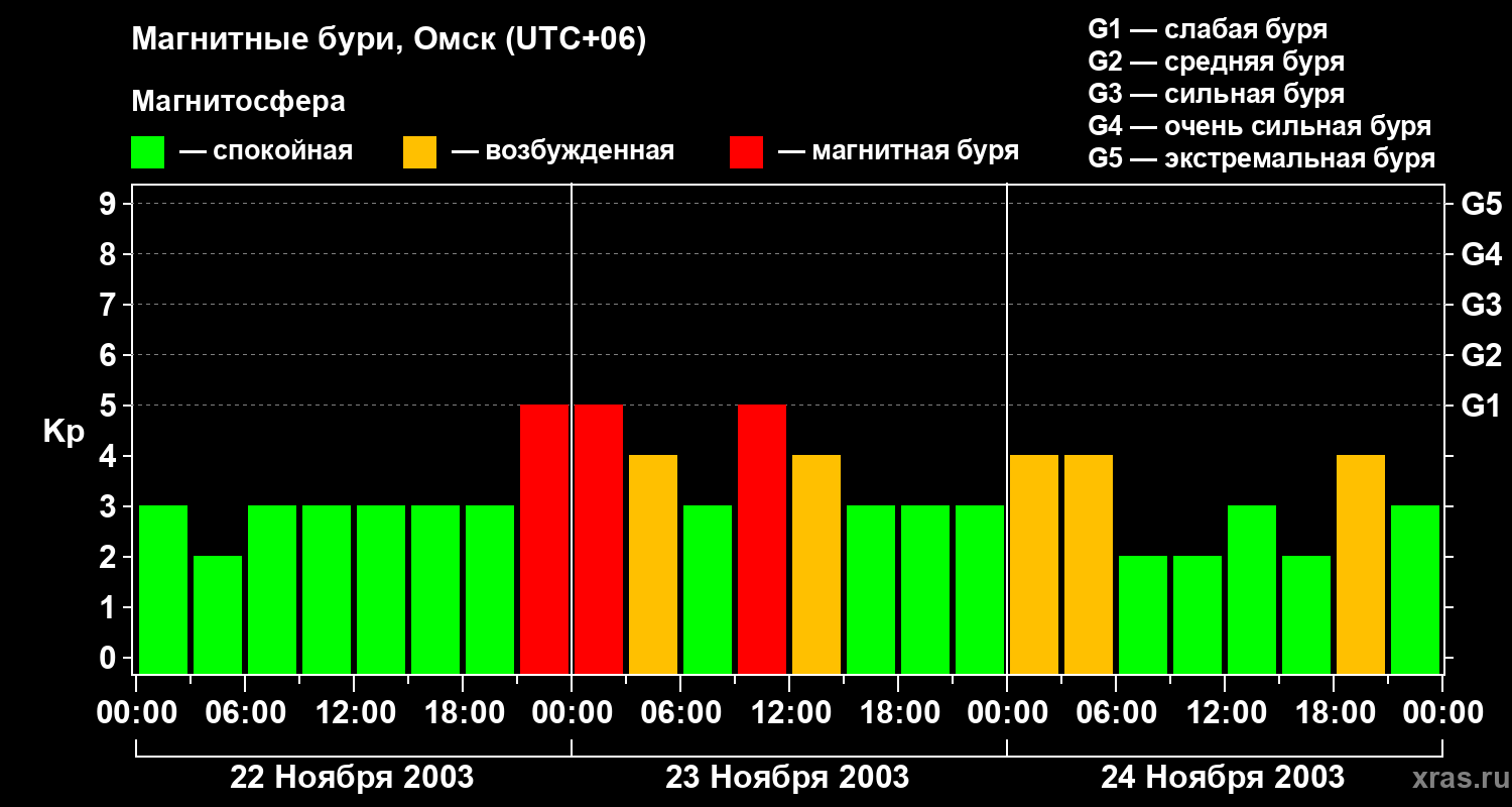 Изменения геомагнитного индекса Kp с 22 по 24 ноября 2003 года для средних широт