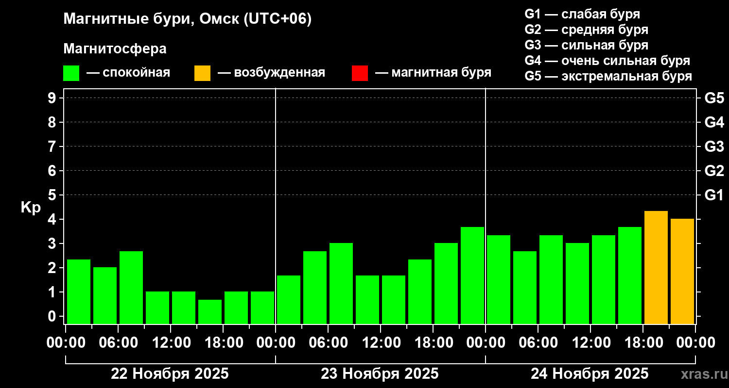 Изменения геомагнитного индекса Kp с 22 по 24 ноября 2025 года для средних широт