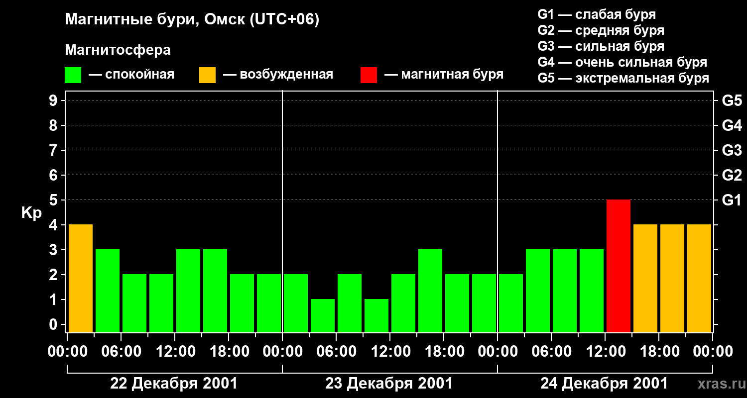 Изменения геомагнитного индекса Kp с 22 по 24 декабря 2001 года для средних широт
