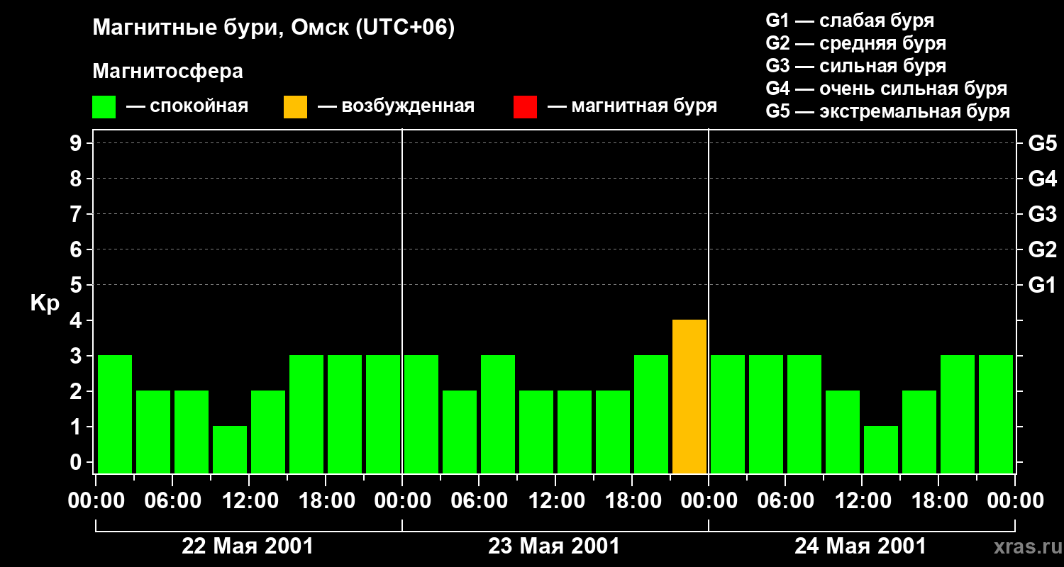 Изменения геомагнитного индекса Kp с 22 по 24 мая 2001 года для средних широт