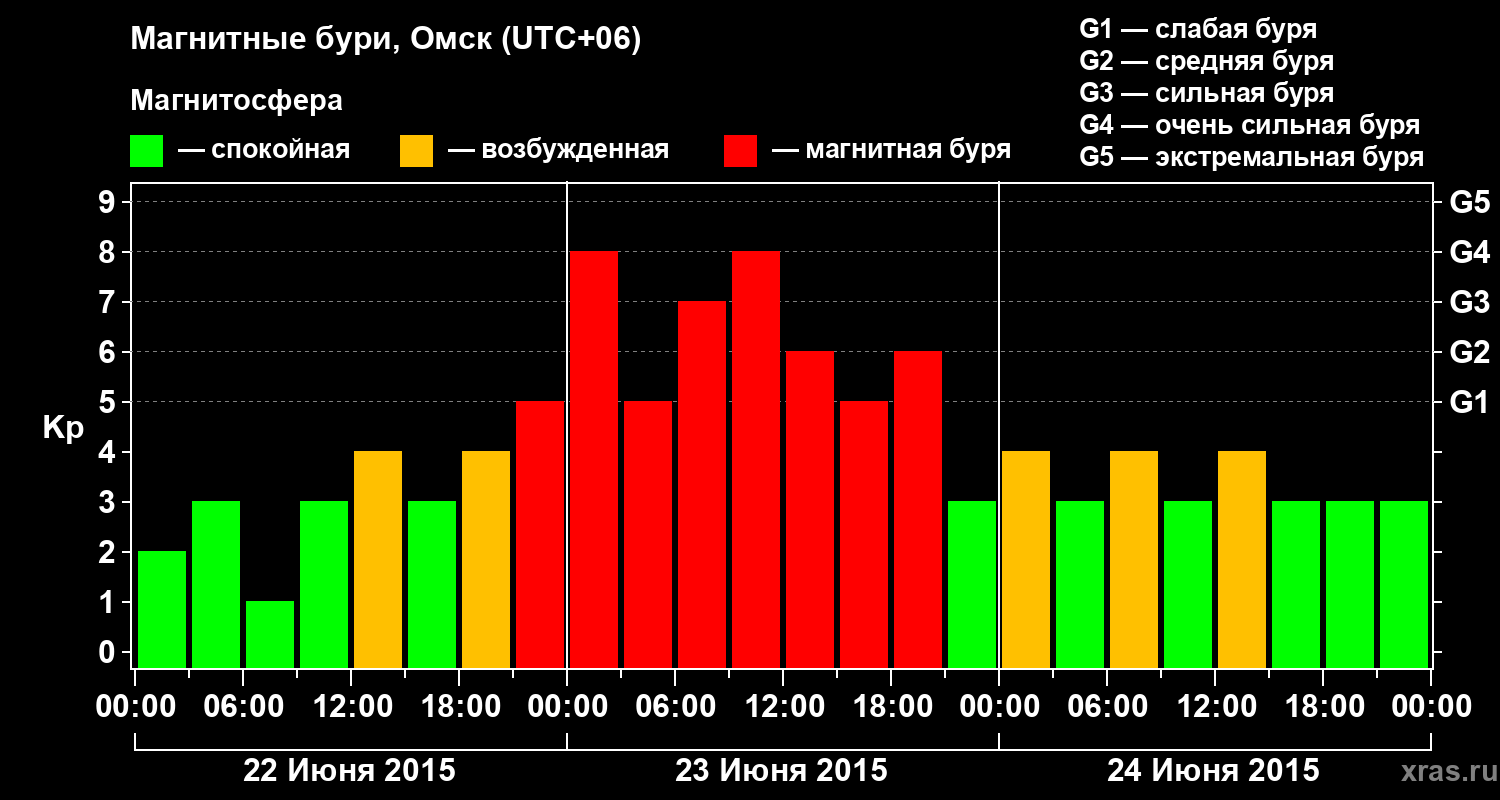 Изменения геомагнитного индекса Kp с 22 по 24 июня 2015 года для средних широт