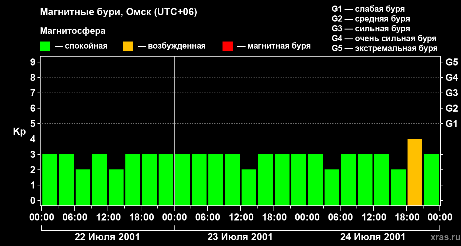 Изменения геомагнитного индекса Kp с 22 по 24 июля 2001 года для средних широт