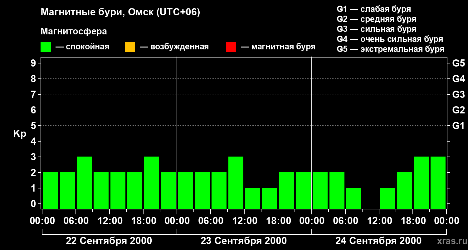 Изменения геомагнитного индекса Kp с 22 по 24 сентября 2000 года для средних широт