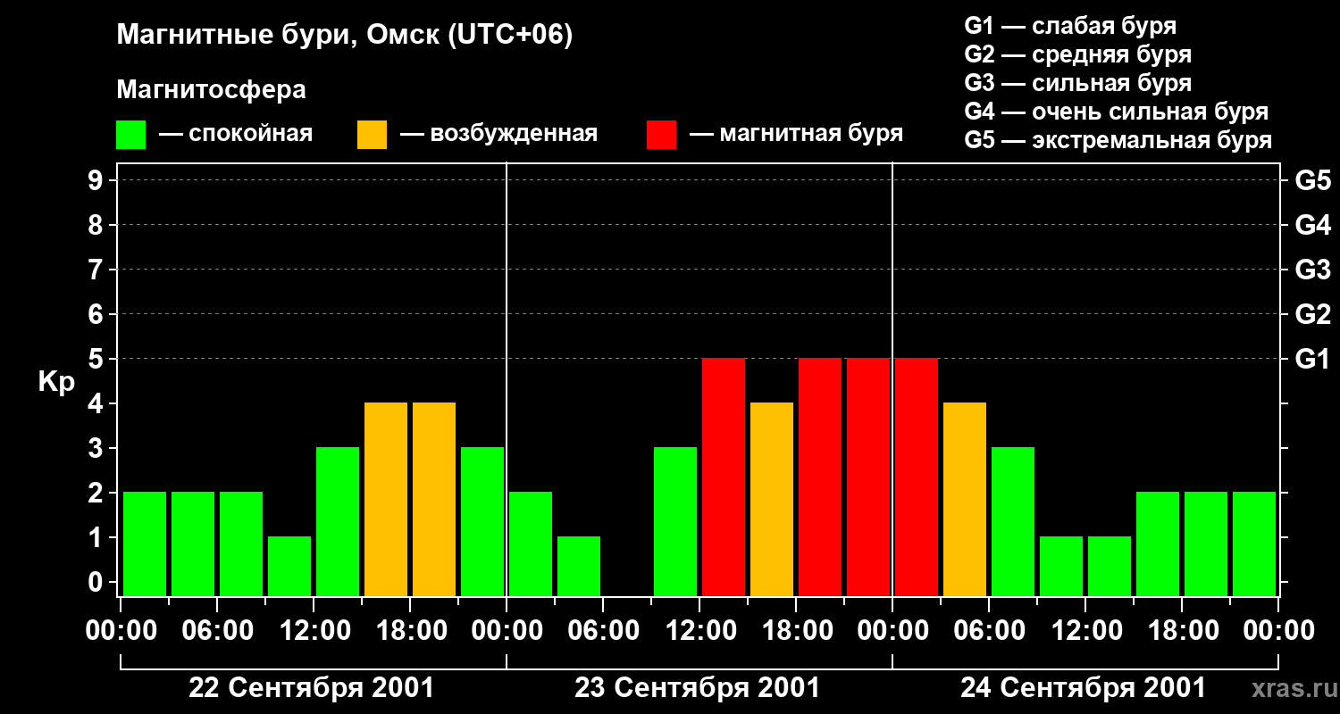 Изменения геомагнитного индекса Kp с 22 по 24 сентября 2001 года для средних широт
