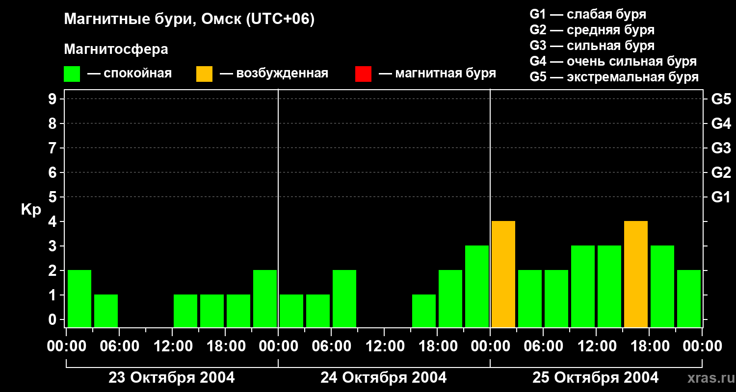 Изменения геомагнитного индекса Kp с 23 по 25 октября 2004 года для средних широт