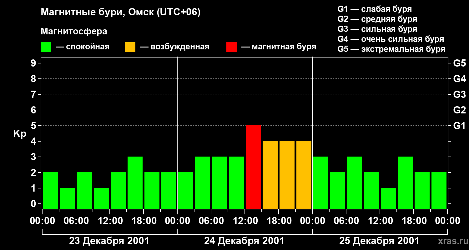 Изменения геомагнитного индекса Kp с 23 по 25 декабря 2001 года для средних широт