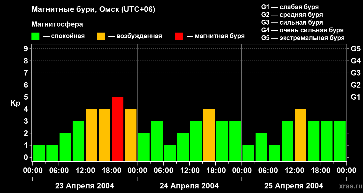Изменения геомагнитного индекса Kp с 23 по 25 апреля 2004 года для средних широт