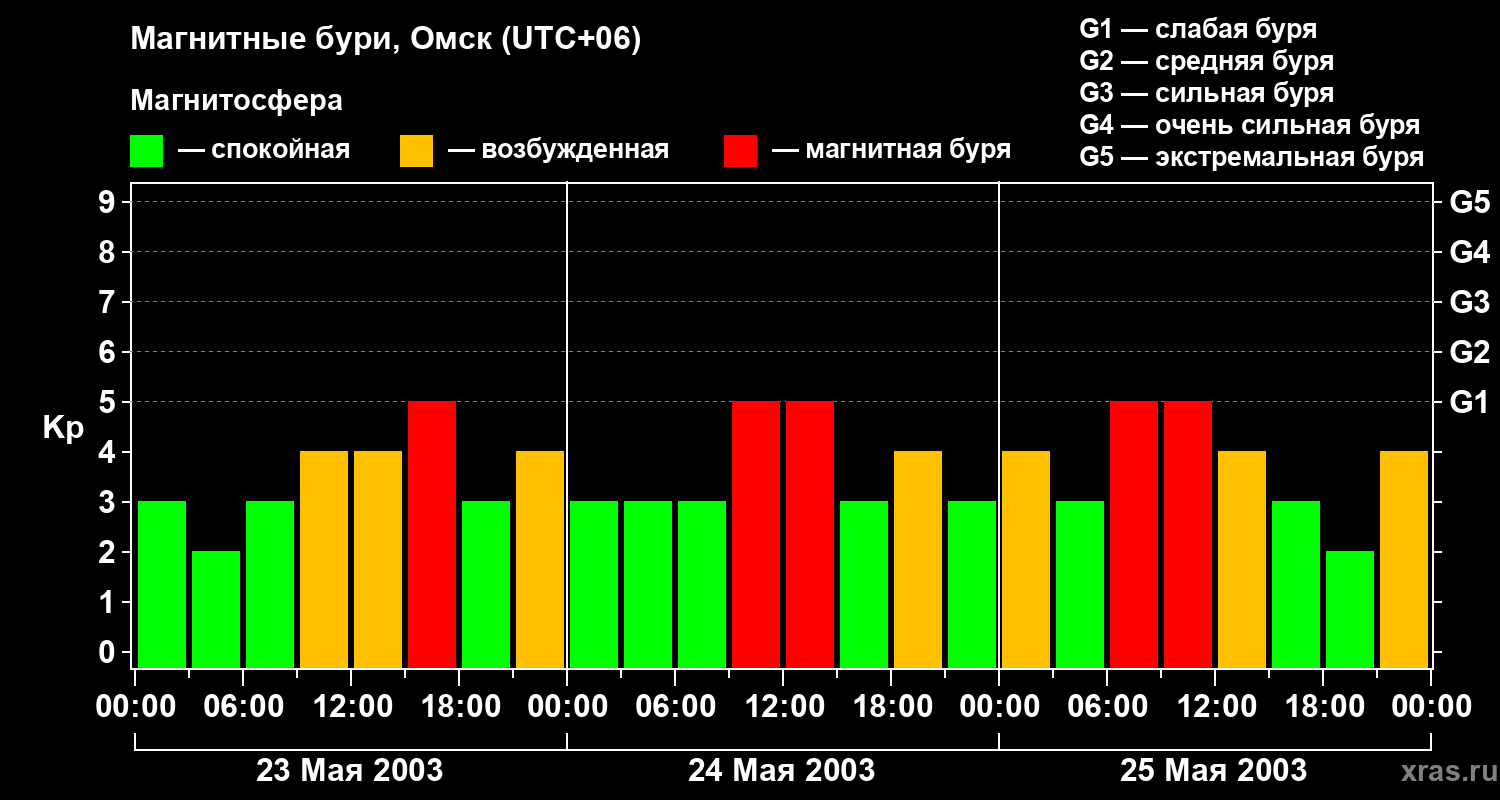 Изменения геомагнитного индекса Kp с 23 по 25 мая 2003 года для средних широт