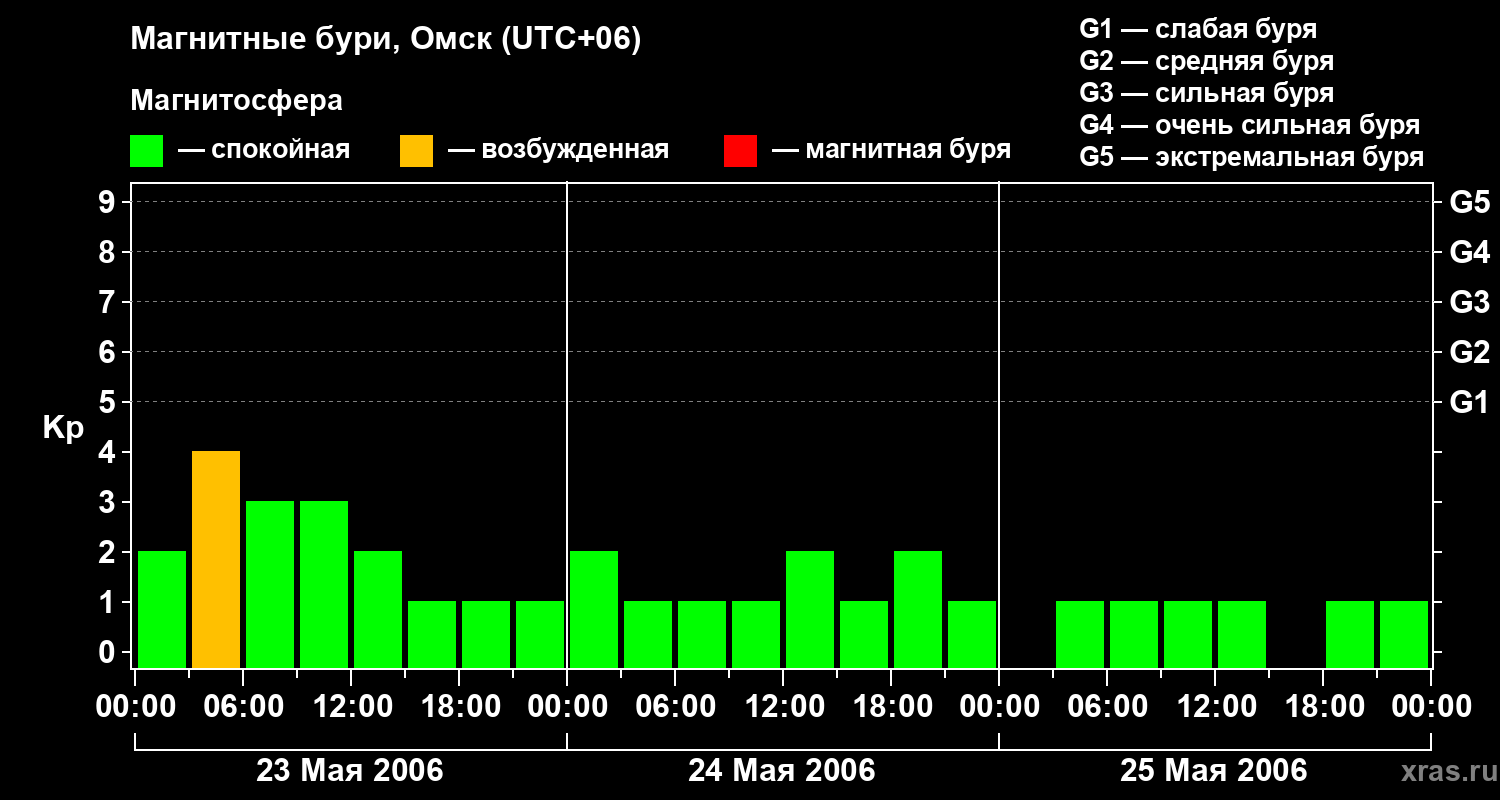 Изменения геомагнитного индекса Kp с 23 по 25 мая 2006 года для средних широт